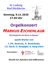 Am 09. November 2025, dem mehrfachen Gedenktag der Deutschen, findet in der St. Ludwigskirche um 17.00 Uhr ein Orgelkonzert mit dem Speyerer Domorganisten Markus Eichenlaub statt, der nicht das erste Mal in Bad Dürkheim zu Gast ist. Unter dem Eindruck des Gedenktages erklingen Stücke von J.-Ph. Rameau, D. Buxtehude, J.S. Bach, O. Respighi, S. Karg-Elert und weitere Werke europäischer Literatur aus unterschiedlichen Epochen. Veranstalter ist die Gemeinde St. Ludwig und St. Michael, mit freundlicher Unterstützung des Fördervereins Kirchenmusik Bad Dürkheim e.V. Der Eintritt ist frei, Spenden sind erwünscht.